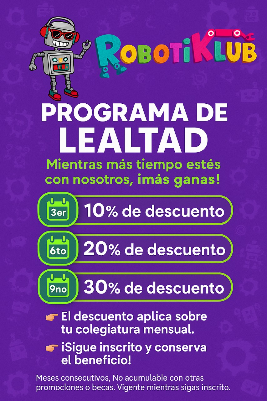 En RobotiKlub, la diversión y el aprendizaje van de la mano. Somos un club donde niños y jóvenes de 7 a 18 años exploran el mundo de la robótica, la programación en bloques y el desarrollo de videojuegos de una manera interactiva y emocionante.